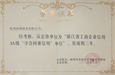 日前,杭州盾牌鏈條有限公司被杭州市余杭區(qū)市場監(jiān)督管理局認(rèn)定為2015年度“浙江省工商企業(yè)信用AA級‘守合同重信用’單位”。這是盾牌公司長期以來樹立“守合同,重信用”的理念,在經(jīng)營中誠信守約、合法經(jīng)營獲得的殊榮。