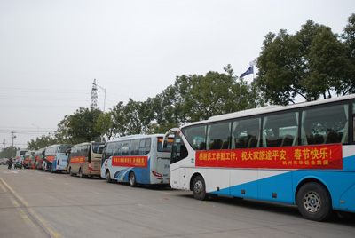 2月6日下午,東華南區(qū)大門前人聲鼎沸,10部貼滿新春美好祝福的包車一字排列,迎接著迫切回老家過(guò)新年的外地員工返鄉(xiāng)。