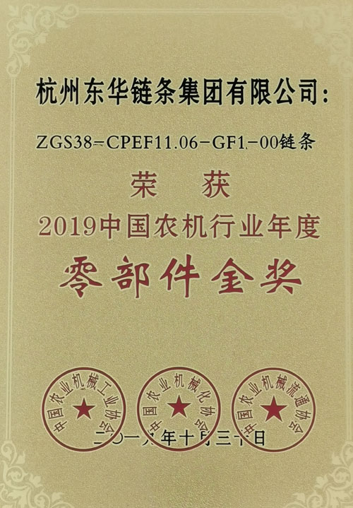 展會期間,舉行了2019中國農(nóng)機(jī)行業(yè)年度頒獎典禮,東華生產(chǎn)的ZGS38-CPEF11.06-GF1玉米收獲機(jī)用鏈條榮獲“2019中國農(nóng)機(jī)行業(yè)年度零部件金獎”,是鏈條行業(yè)唯一獲此殊榮的產(chǎn)品,是中國農(nóng)機(jī)行業(yè)的最高榮譽(yù)。該產(chǎn)品具有結(jié)構(gòu)新,用途巧等特點(diǎn),是東華近年來研發(fā)的高端鏈條產(chǎn)品。