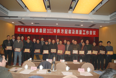 隨后,張寶康副總宣布2010年“優(yōu)秀供方”與“特別貢獻(xiàn)獎”供方名單,與會領(lǐng)導(dǎo)向獲獎供應(yīng)商頒發(fā)了證書并合影留念.杭州萬盛精拉絲有限公司崔總作為“優(yōu)秀供方”代表與 杭州三志緊固件軸承有限公司屠董作為“特別貢獻(xiàn)獎”代表上臺作了發(fā)言。