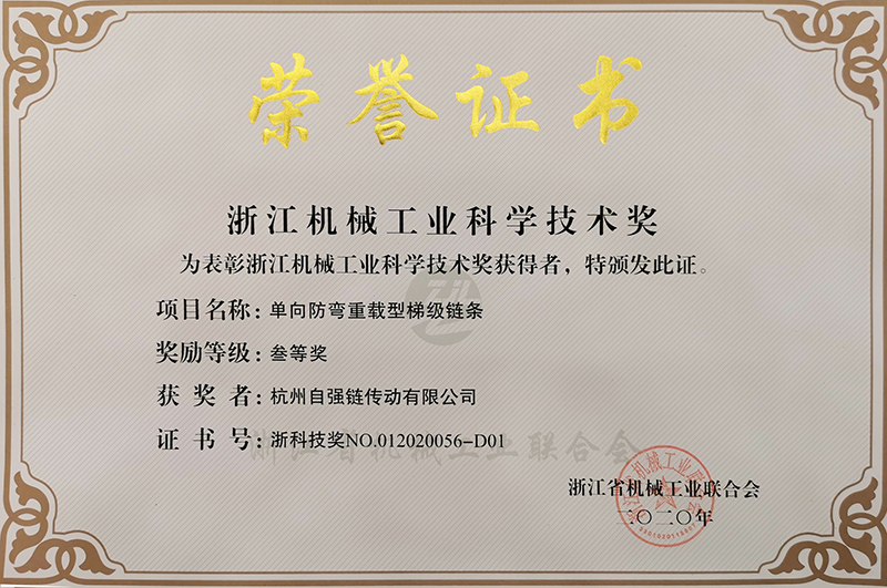 4月29日,浙江省機(jī)械工業(yè)聯(lián)合會(huì)召開會(huì)員大會(huì),會(huì)上表彰了2020年度浙江機(jī)械工業(yè)科學(xué)技術(shù)獎(jiǎng)。集團(tuán)下屬子公司杭州自強(qiáng)鏈傳動(dòng)公司的高端產(chǎn)品“單向防彎重載型梯級(jí)鏈條”榮獲三等獎(jiǎng)。這是東華集團(tuán)產(chǎn)品創(chuàng)新項(xiàng)目連續(xù)九年榮獲浙江機(jī)械科技獎(jiǎng),也是2020年度全省機(jī)械工業(yè)科技創(chuàng)新成果獎(jiǎng)項(xiàng)中唯一的鏈傳動(dòng)企業(yè)的高端產(chǎn)品獲獎(jiǎng)。
