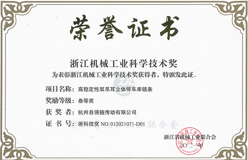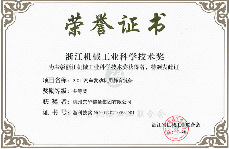6月30日,浙江省機(jī)械工業(yè)聯(lián)合會(huì)召開會(huì)員大會(huì)。會(huì)上表彰2021年度浙江機(jī)械工業(yè)科學(xué)技術(shù)獎(jiǎng),全省機(jī)械領(lǐng)域共有72項(xiàng)科技創(chuàng)新項(xiàng)目獲獎(jiǎng)。東華 “2.0T汽車發(fā)動(dòng)機(jī)用靜音鏈條”和“高穩(wěn)定性雙吊耳立體停車庫(kù)鏈條”均獲三等獎(jiǎng),這是東華產(chǎn)品創(chuàng)新項(xiàng)目連續(xù)十年榮獲浙江機(jī)械工業(yè)科技獎(jiǎng),也是2021年度全省機(jī)械行業(yè)科技創(chuàng)新成果獎(jiǎng)中唯一鏈傳動(dòng)企業(yè)的高端產(chǎn)品獲獎(jiǎng)。