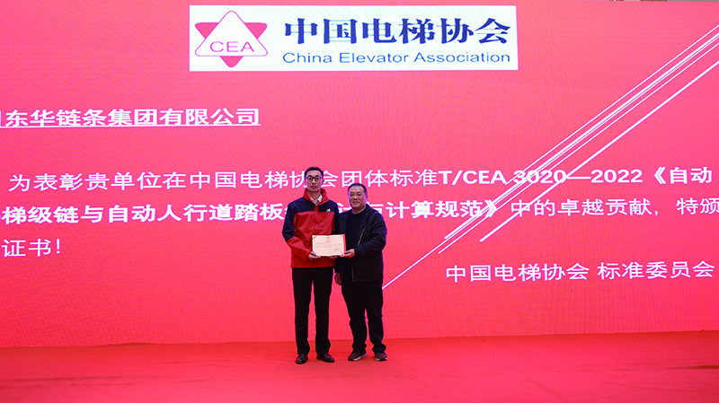 近日,中國(guó)電梯協(xié)會(huì)標(biāo)準(zhǔn)委員會(huì)授予東華鏈條集團(tuán)榮譽(yù)證書(shū),以表彰東華在中國(guó)電梯團(tuán)體標(biāo)準(zhǔn)T/CEA 3020-2022《自動(dòng)扶梯梯級(jí)鏈與自動(dòng)人行道踏板鏈設(shè)計(jì)與計(jì)算規(guī)范》中的卓越貢獻(xiàn)。東華扶梯工程鏈?zhǔn)聵I(yè)部代表公司出席了頒獎(jiǎng)儀式。