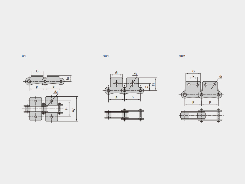 | 單節(jié)距帶K1附件 | 單節(jié)距帶SK1附件 | 單節(jié)距帶加長(zhǎng)銷(xiāo)軸附件 |