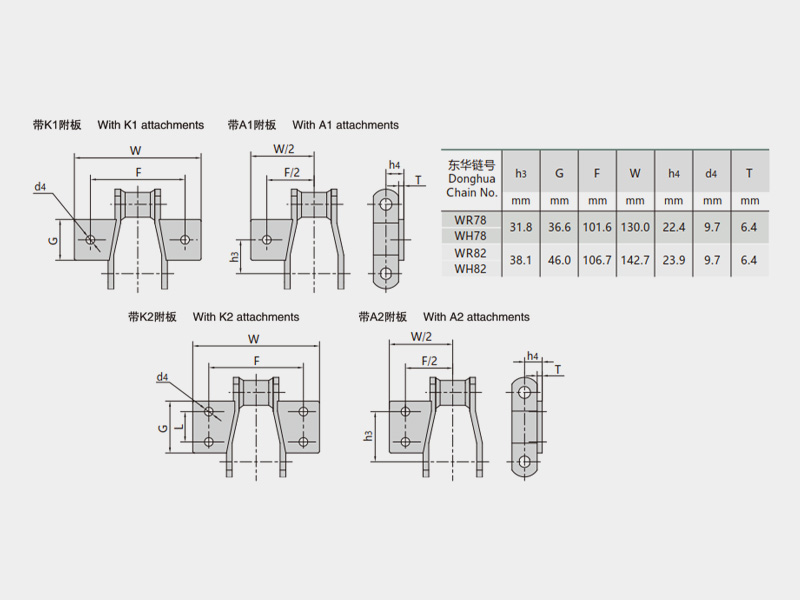 ● 工程用焊接結(jié)構(gòu)彎板鏈按照ASME B29.16M《鋼制焊接工程鏈、附件和鏈輪齒形》和ISO 6972《焊接結(jié)構(gòu)工程用彎板鏈、附件和鏈輪》設計和制造,有多種附件可供選擇,也可以按照用戶需求進行定制開發(fā)。
